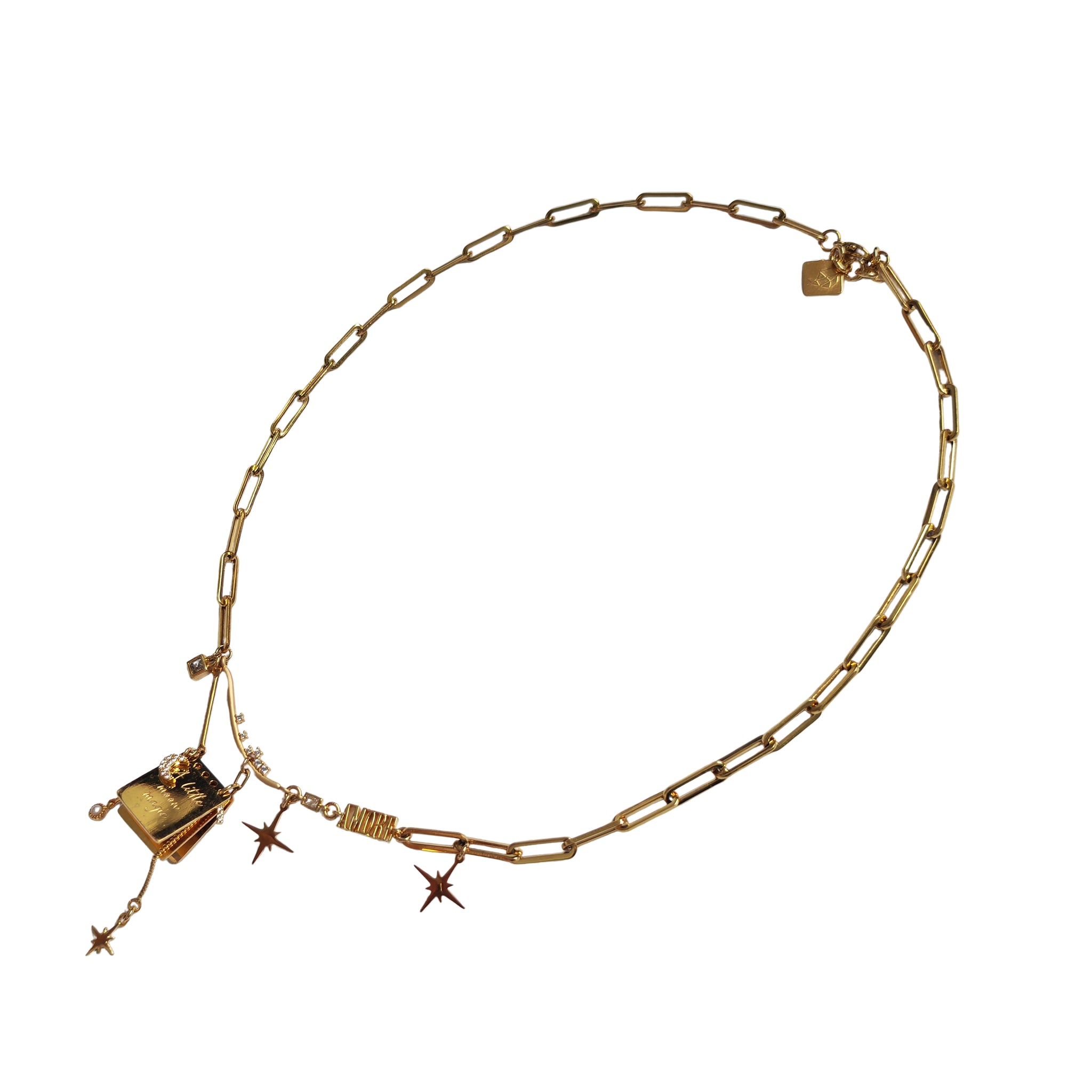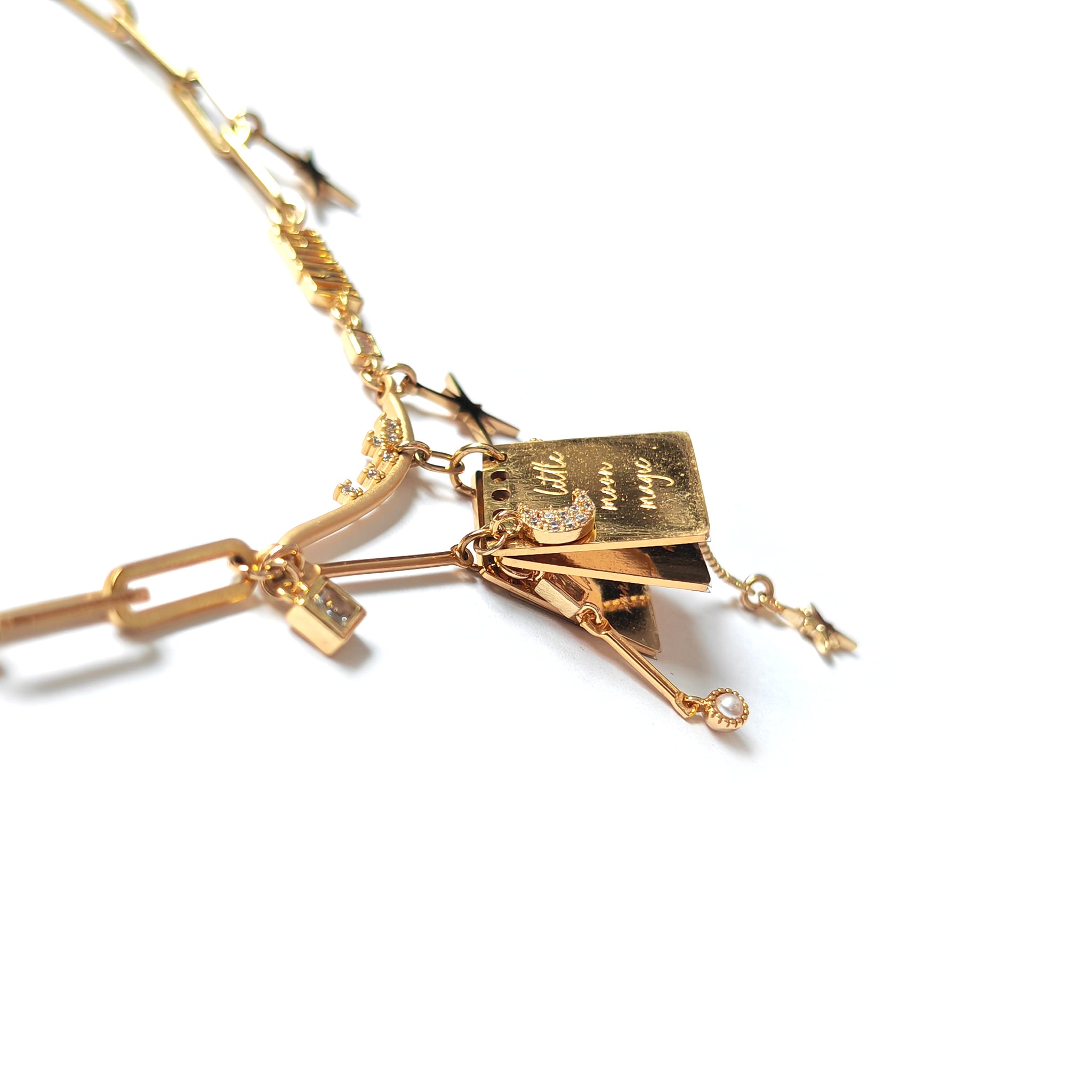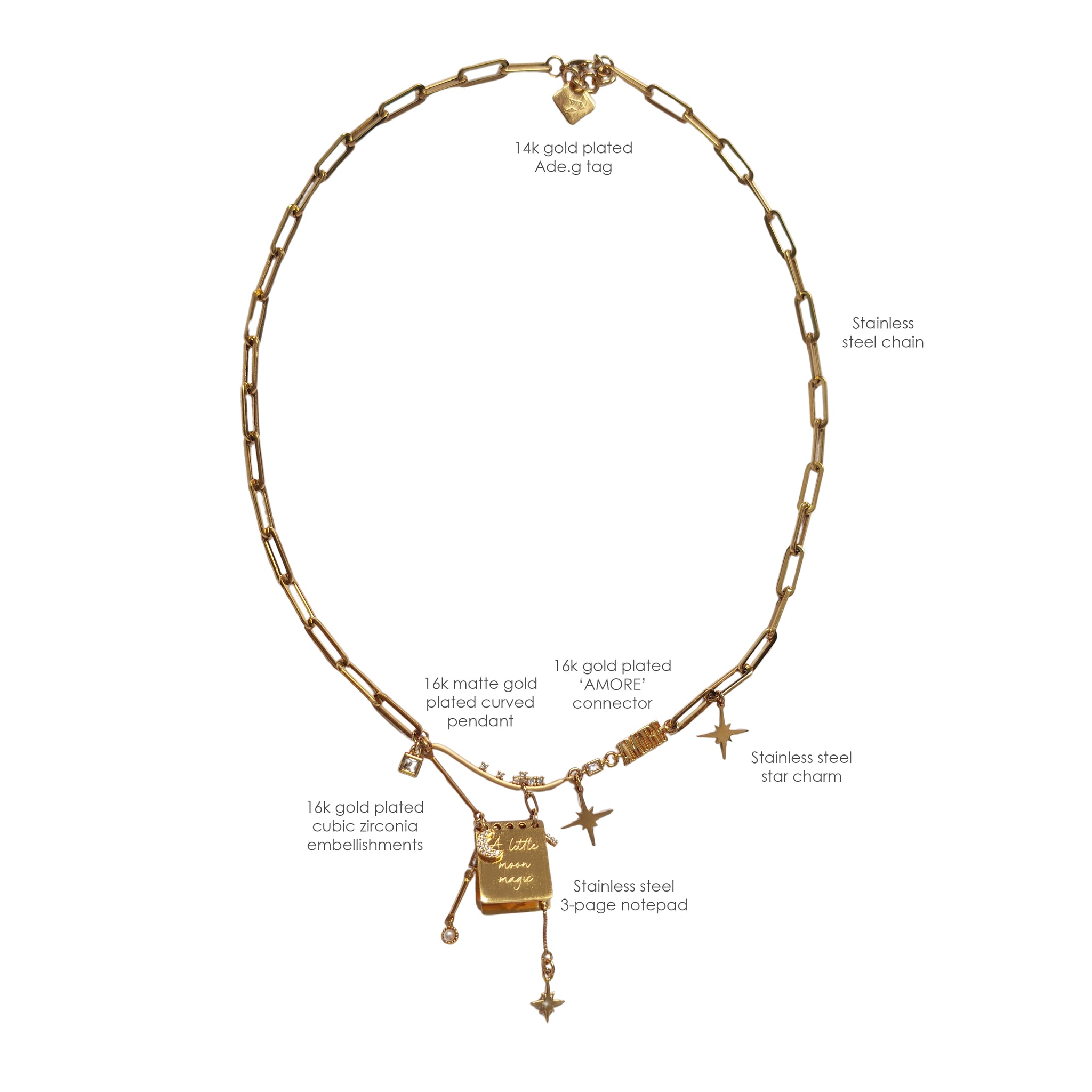 *Note: The notepad charms are made of polished stainless steel, and due to the flat, reflective surface, subtle surface marks may be visible under certain light, which are normal characteristics of the material and finish. matte gold plated curved cubic zirconia studded pendant.