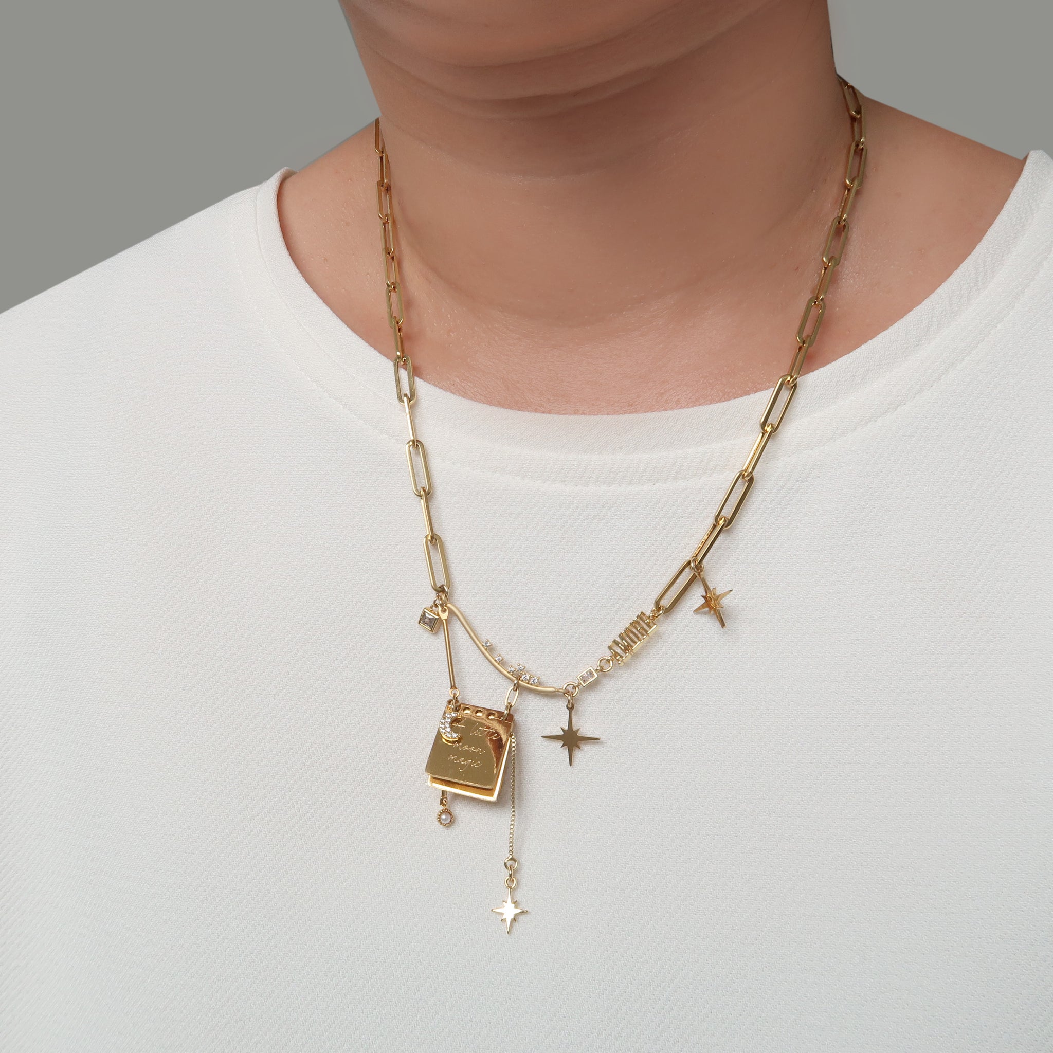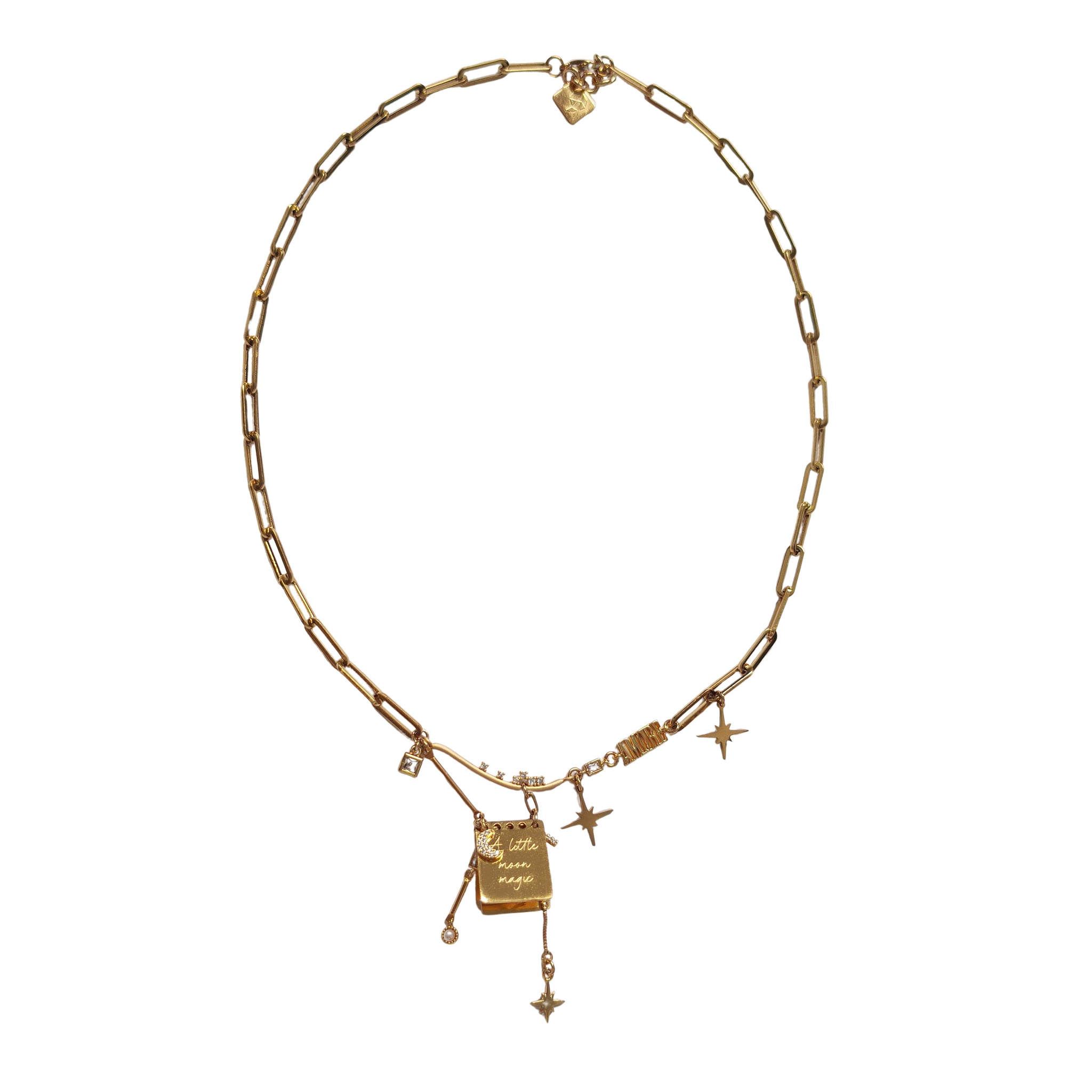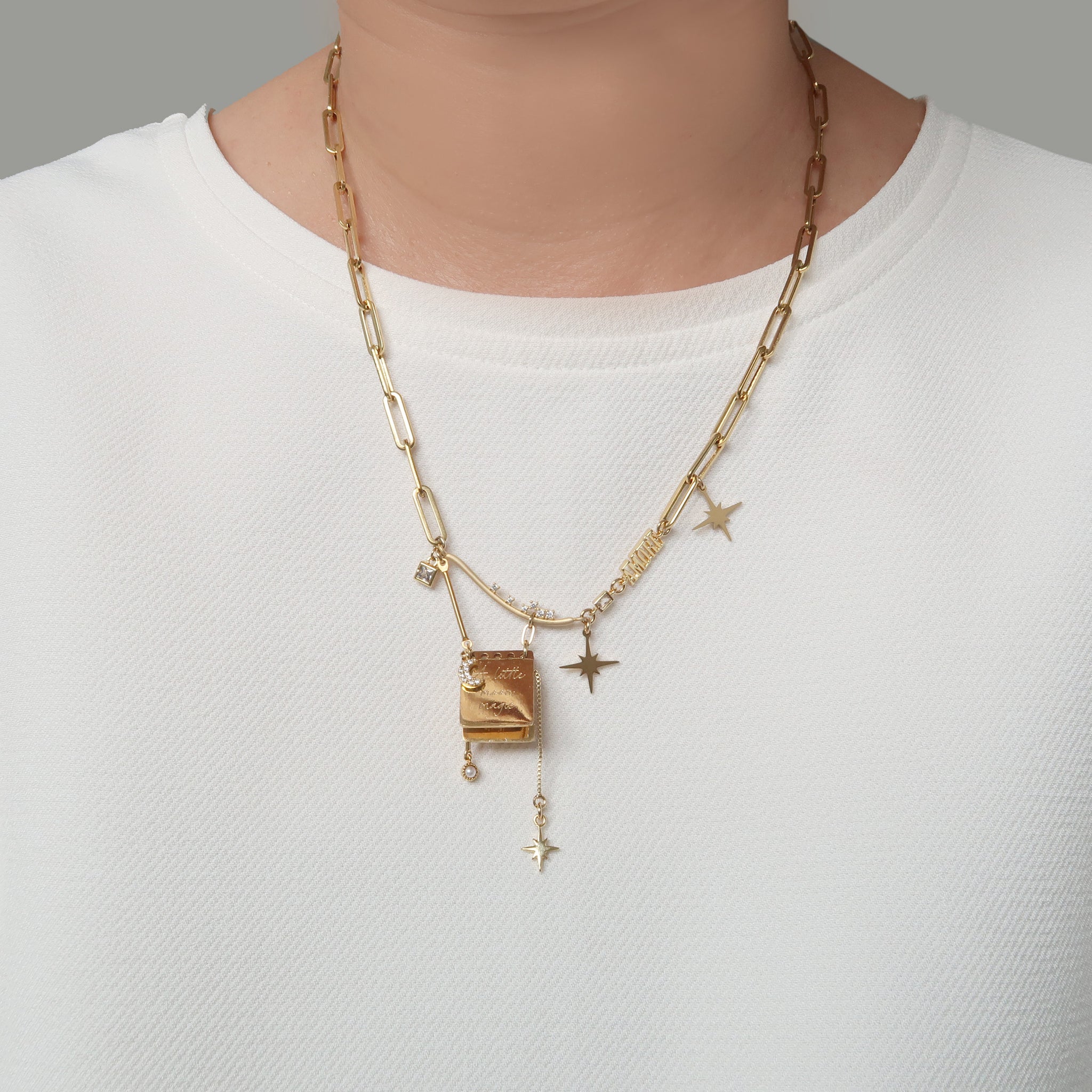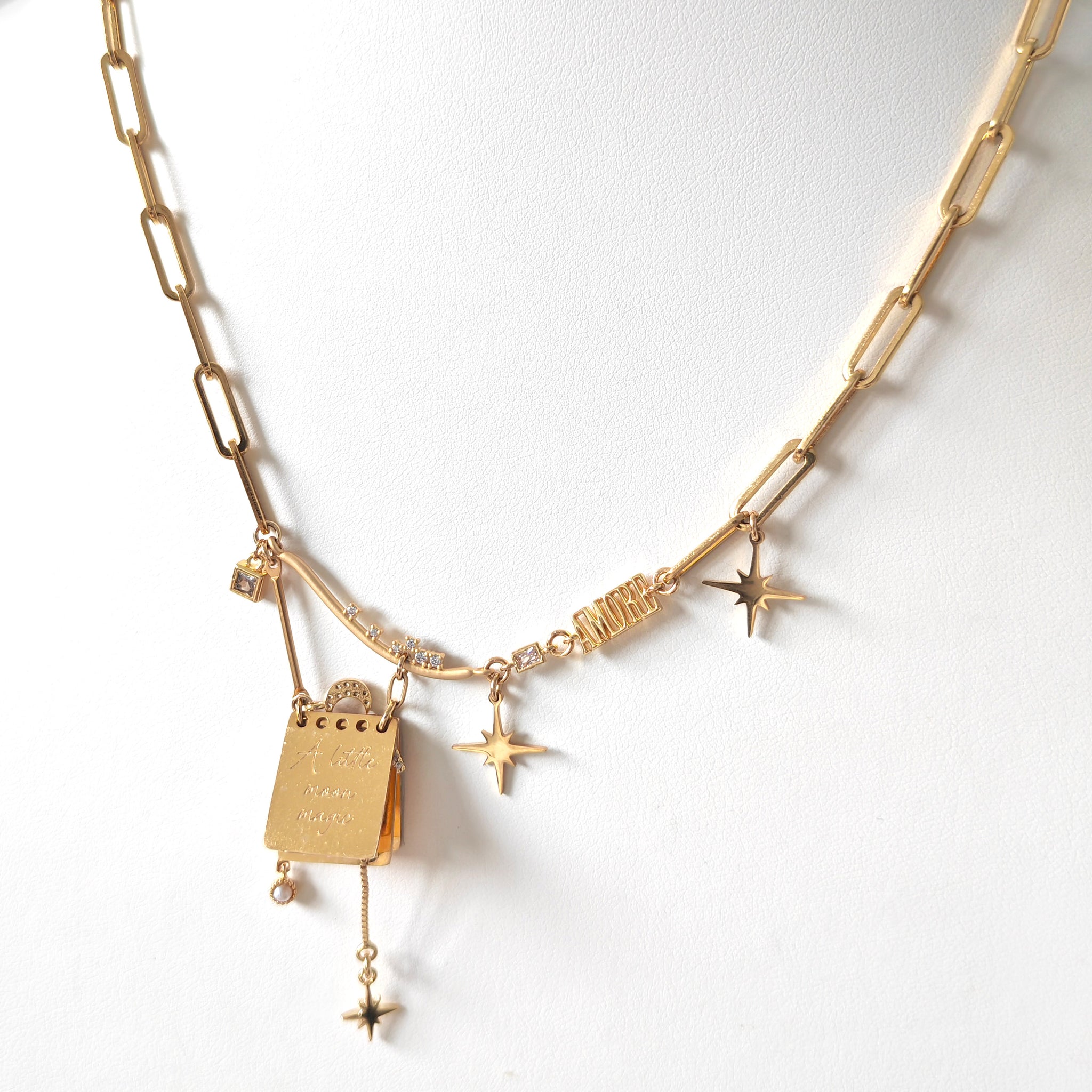 *Note: The notepad charms are made of polished stainless steel, and due to the flat, reflective surface, subtle surface marks may be visible under certain light, which are normal characteristics of the material and finish. matte gold plated curved cubic zirconia studded pendant.