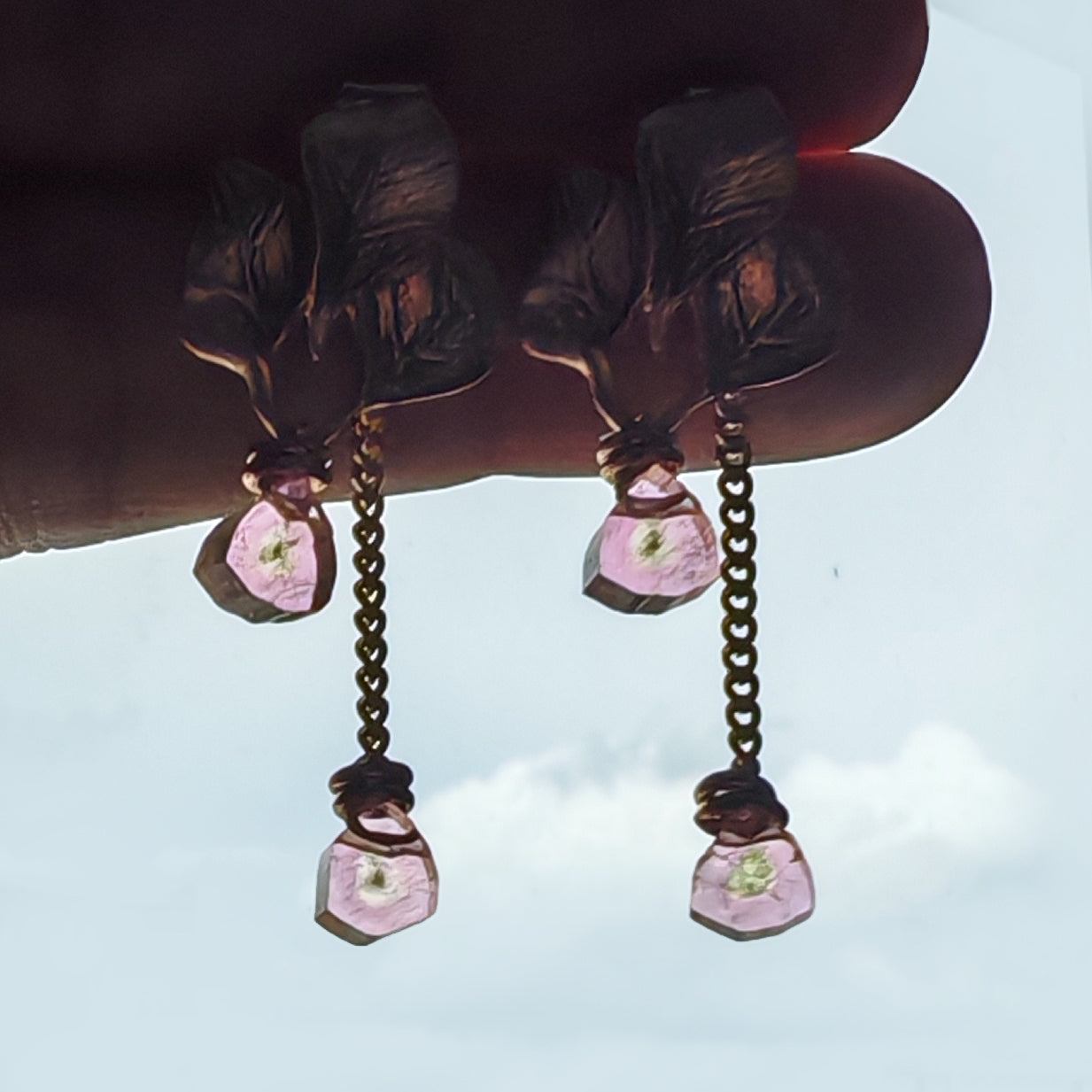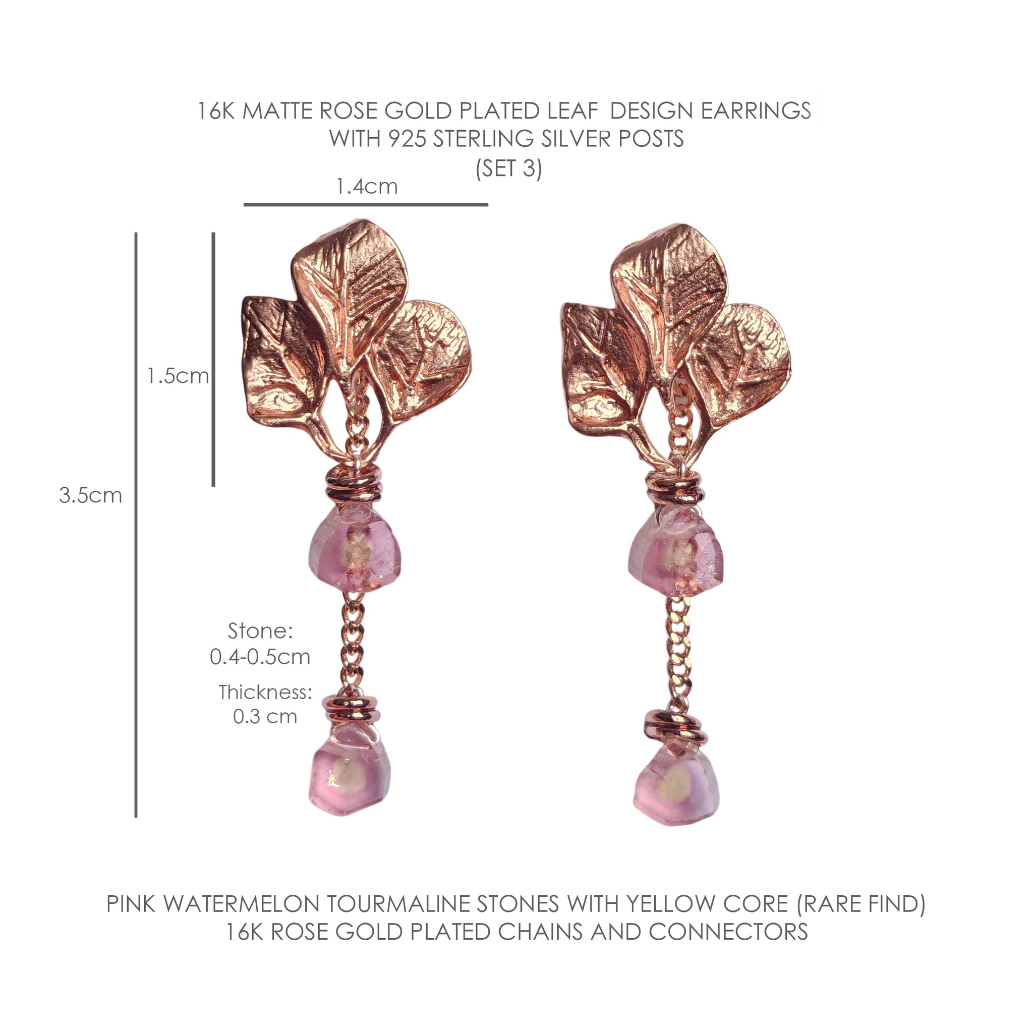 The tourmaline/watermelon tourmaline stones in this collection are sliced and polished with raw edges. These gems naturally have pre-existing chips, scratches, uneven corners, and inclusions. They are chosen for their rare colours and unique textures/patterns. Each pair is one of a kind.