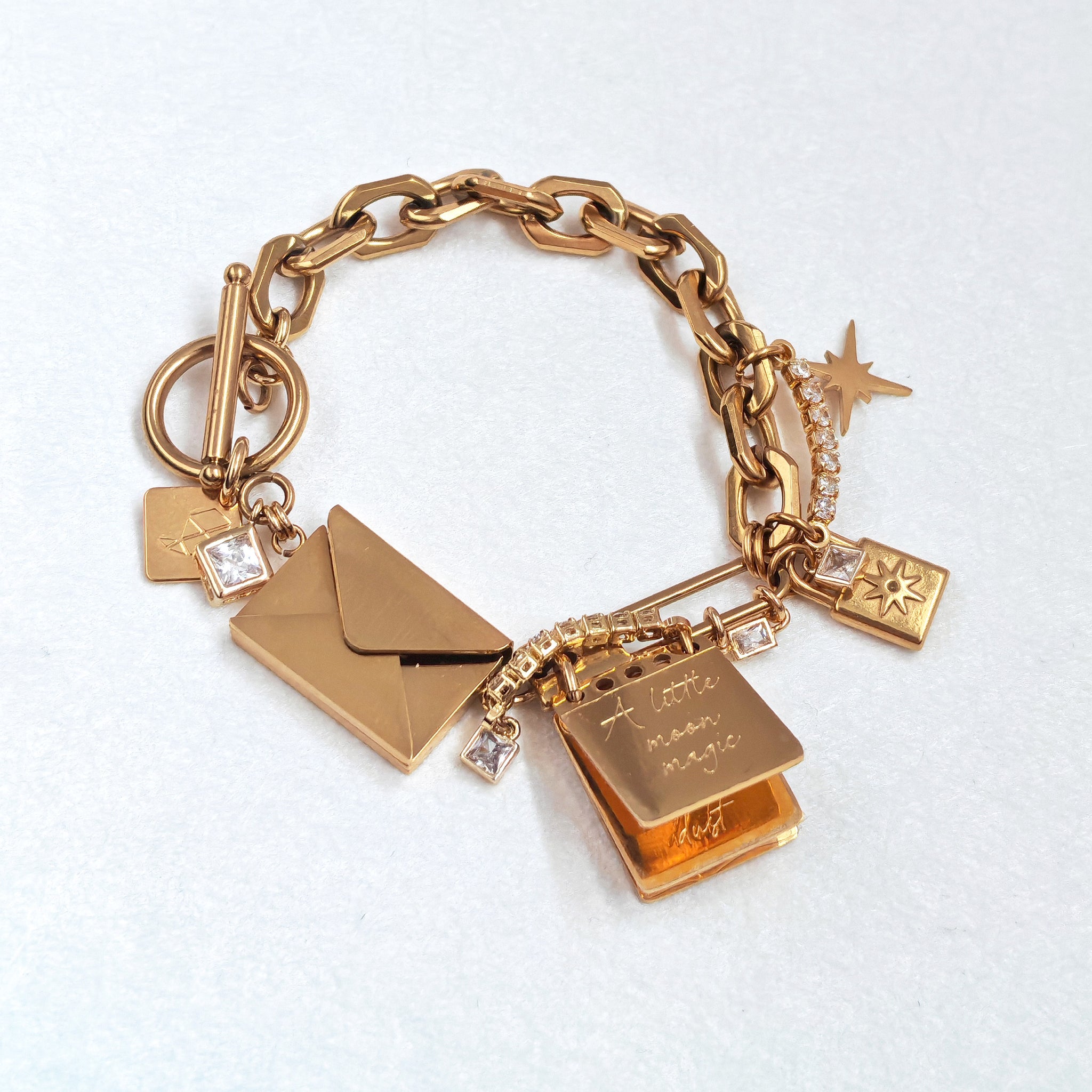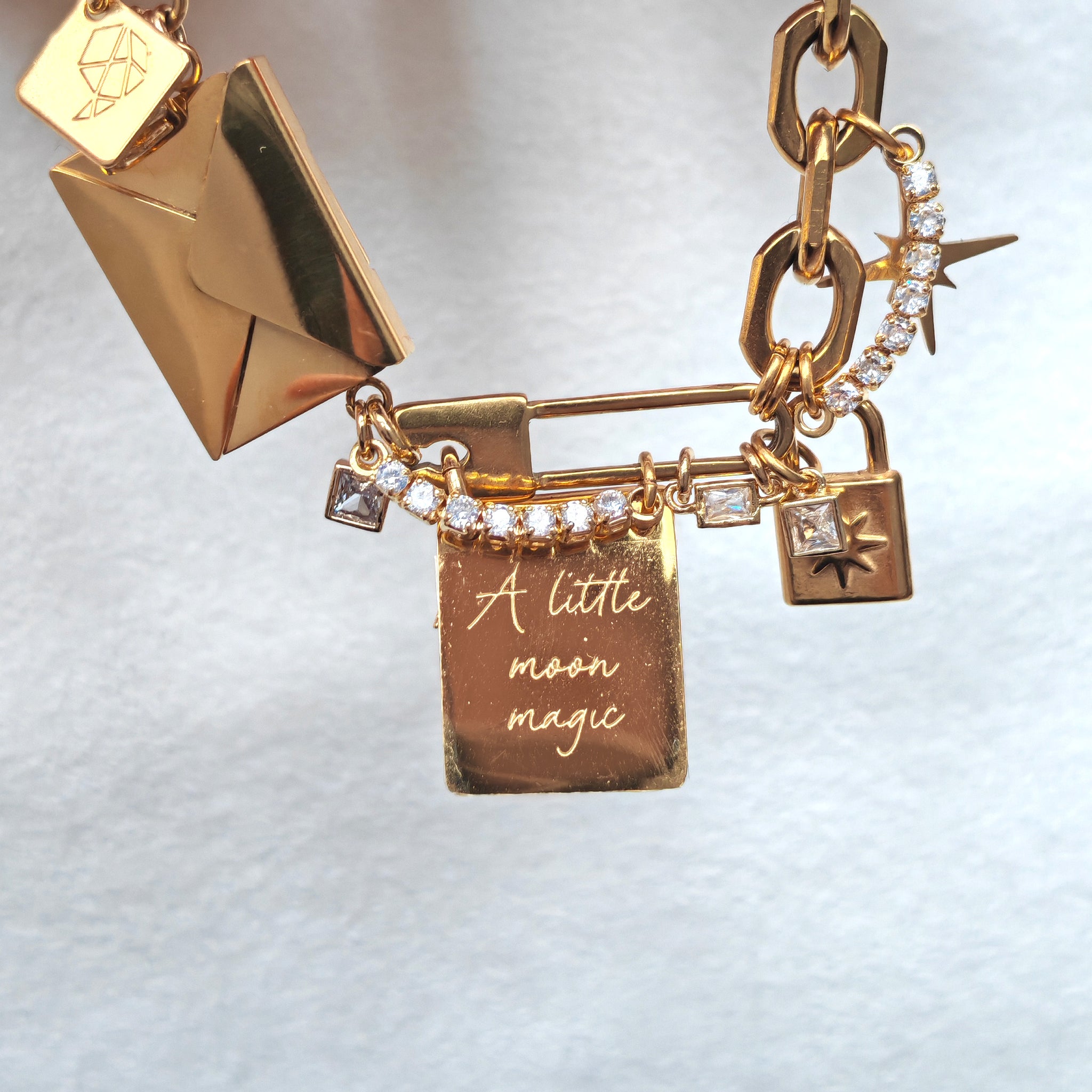 *Note: The notepad charms are made of polished stainless steel, and due to the flat, reflective surface, subtle surface marks may be visible under certain light, which are normal characteristics of the material and finish. matte gold plated curved cubic zirconia studded pendant.