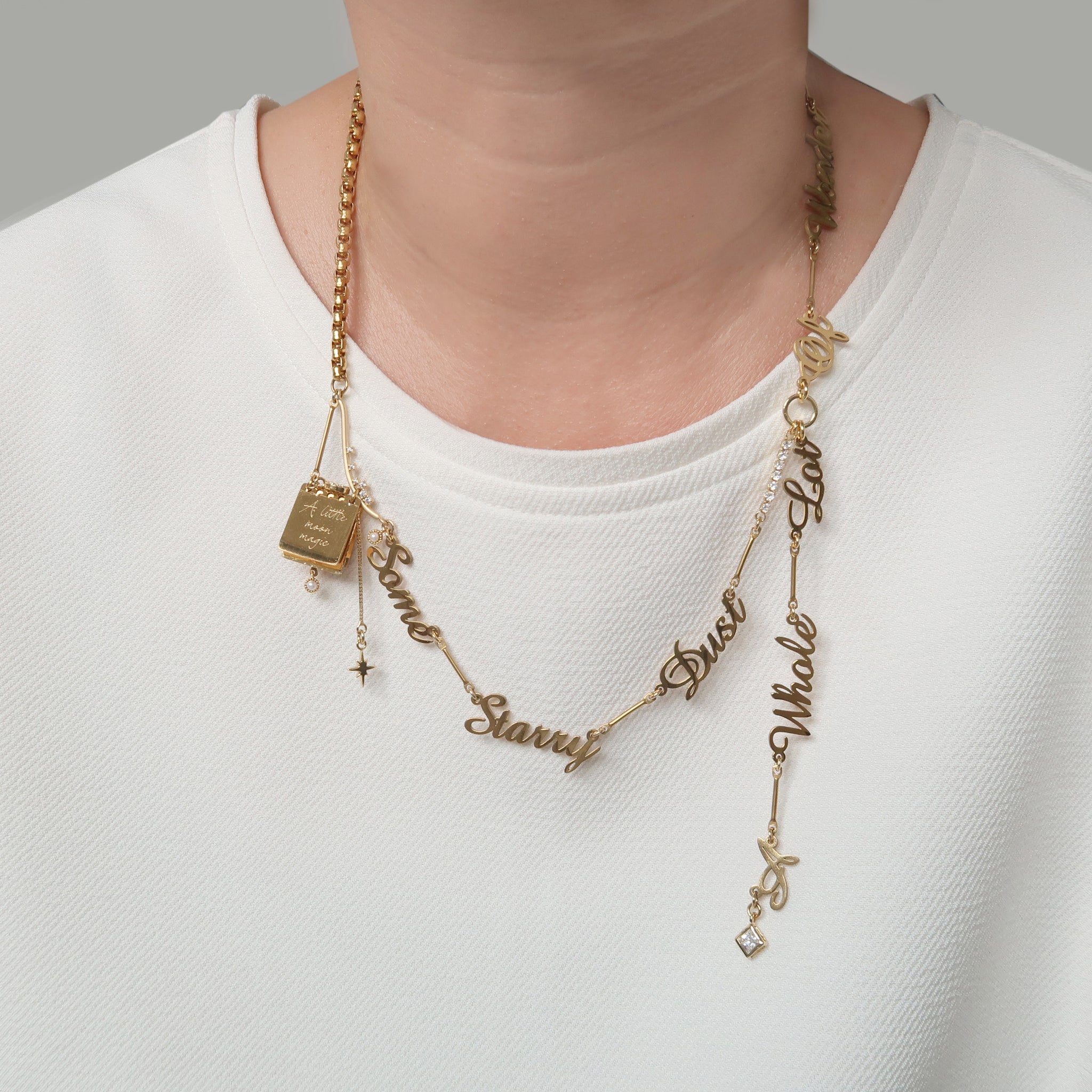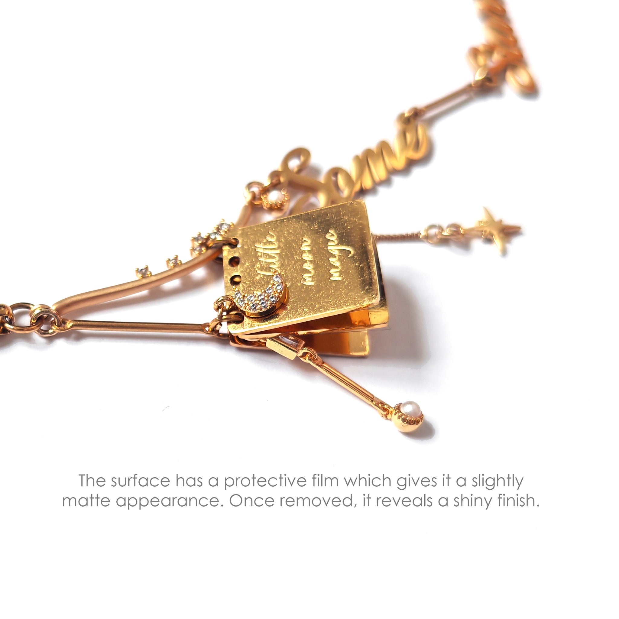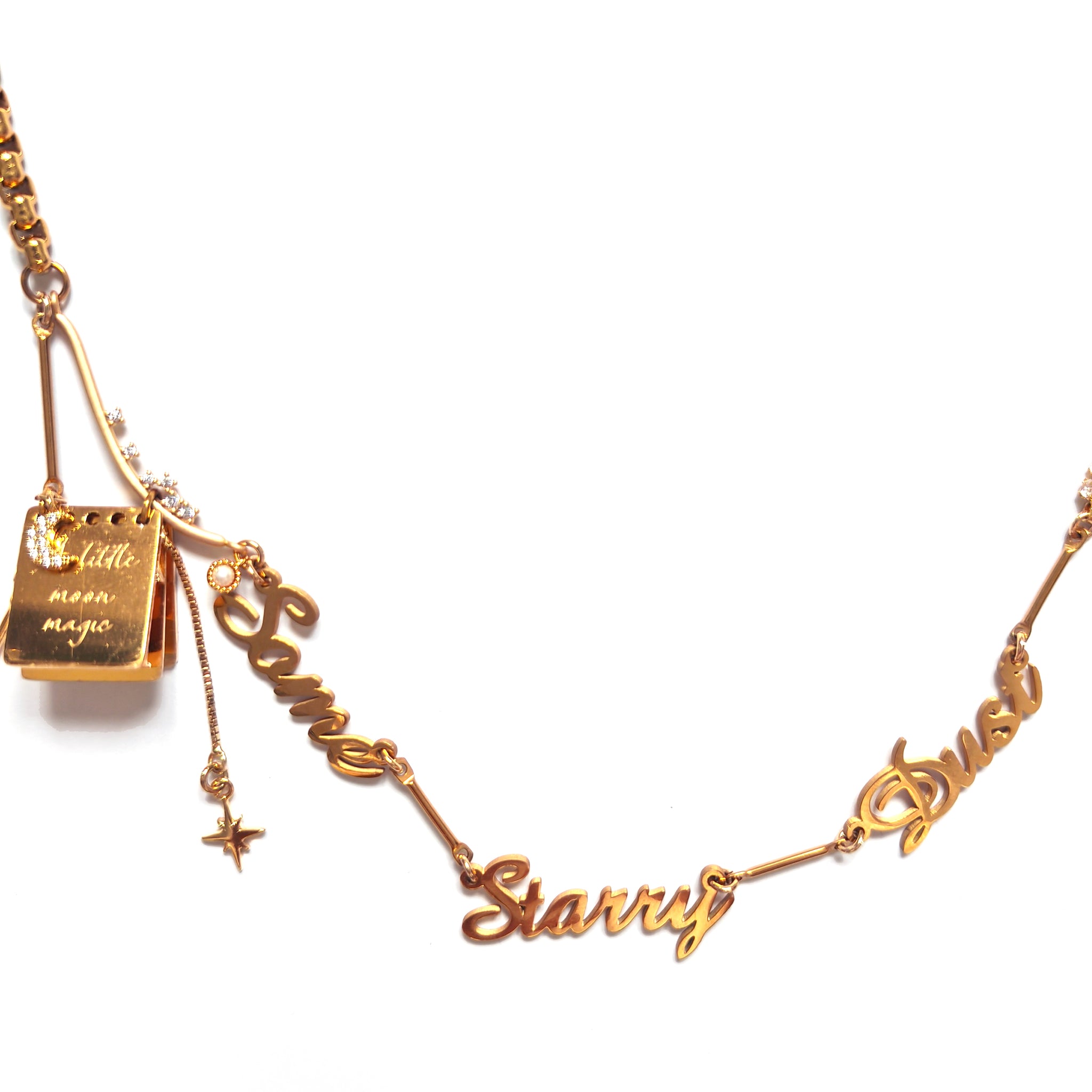 . 2-tier message necklace made of stainless steel - 'some starry dust' & 'a whole lot of wonder'. The first page reads ‘a little moon magic’, with the next two pages flowing out as linked word pendants.