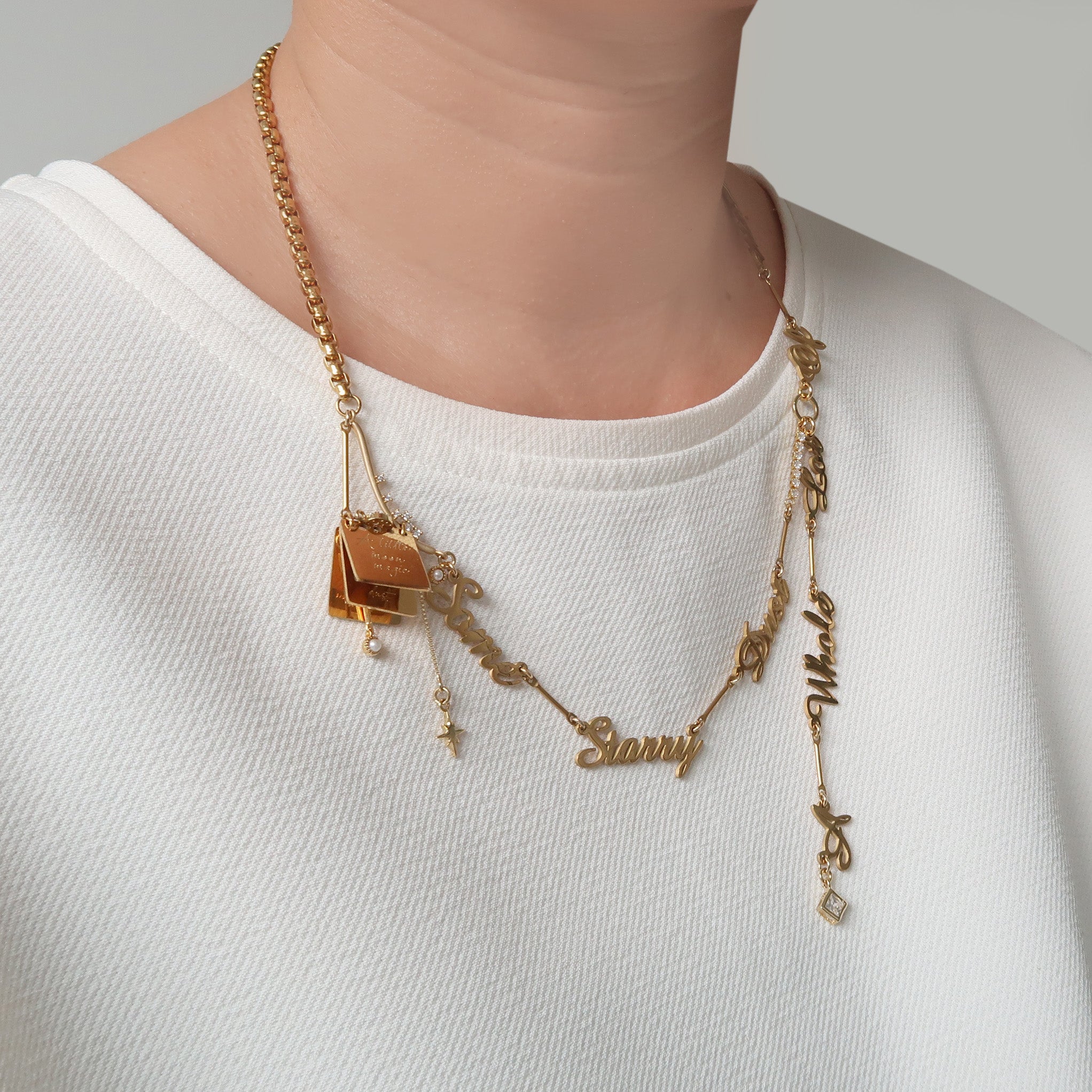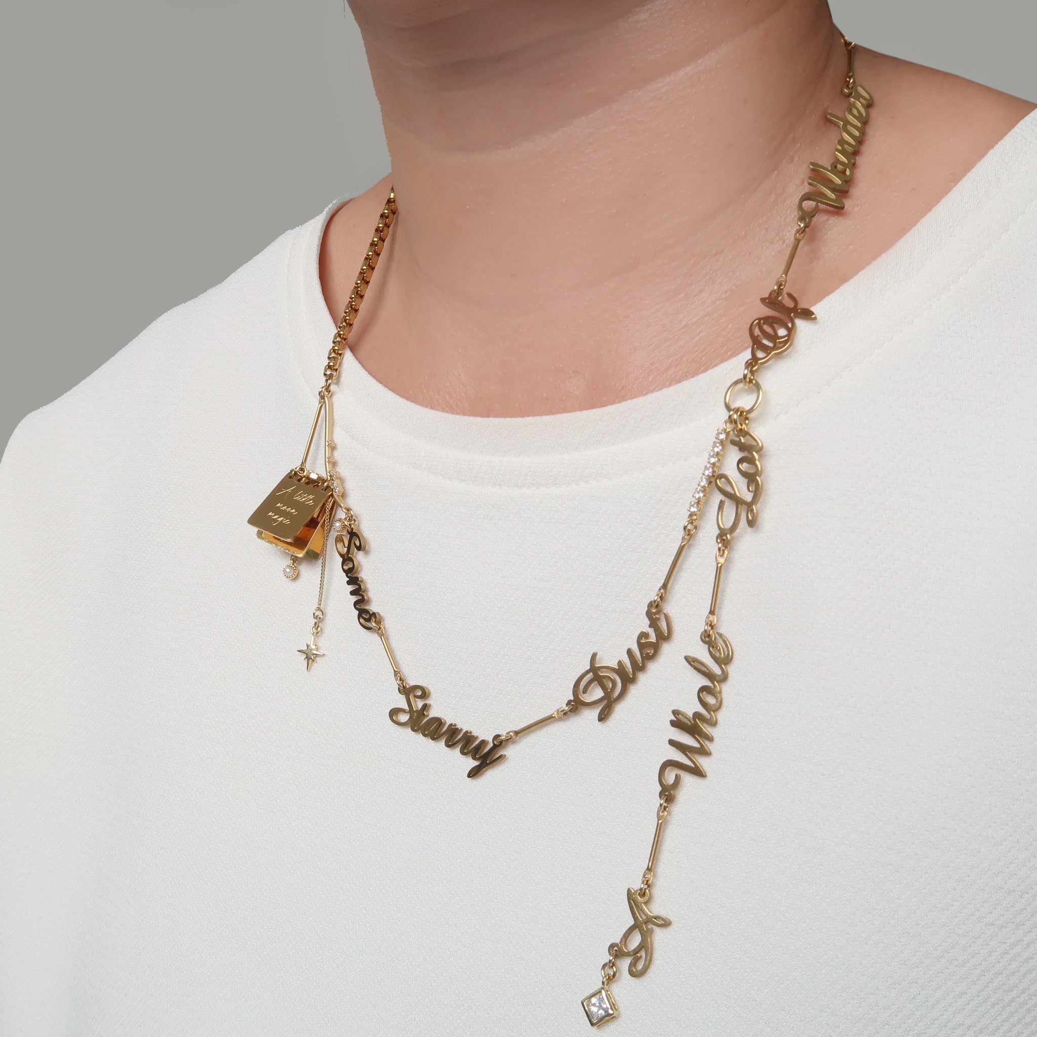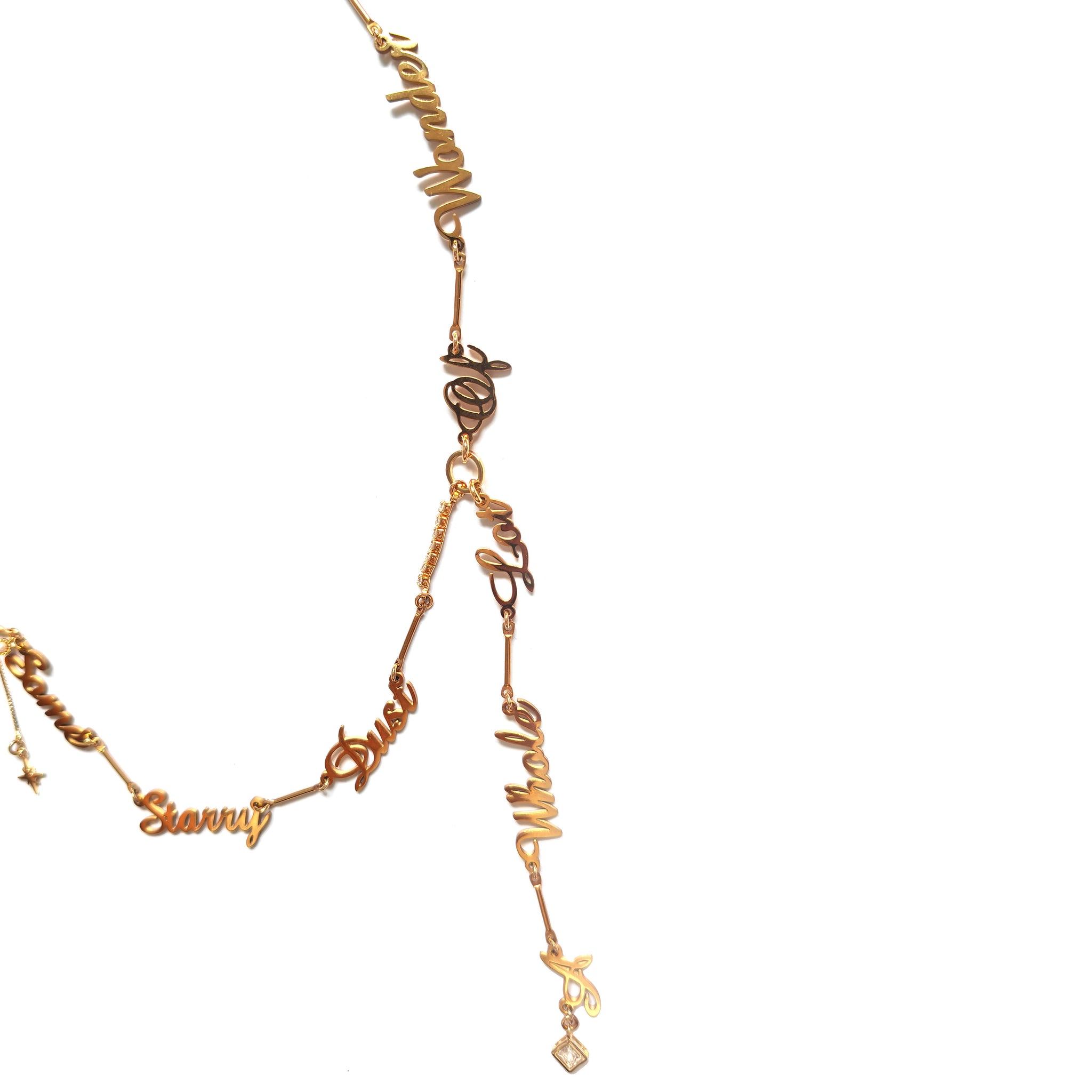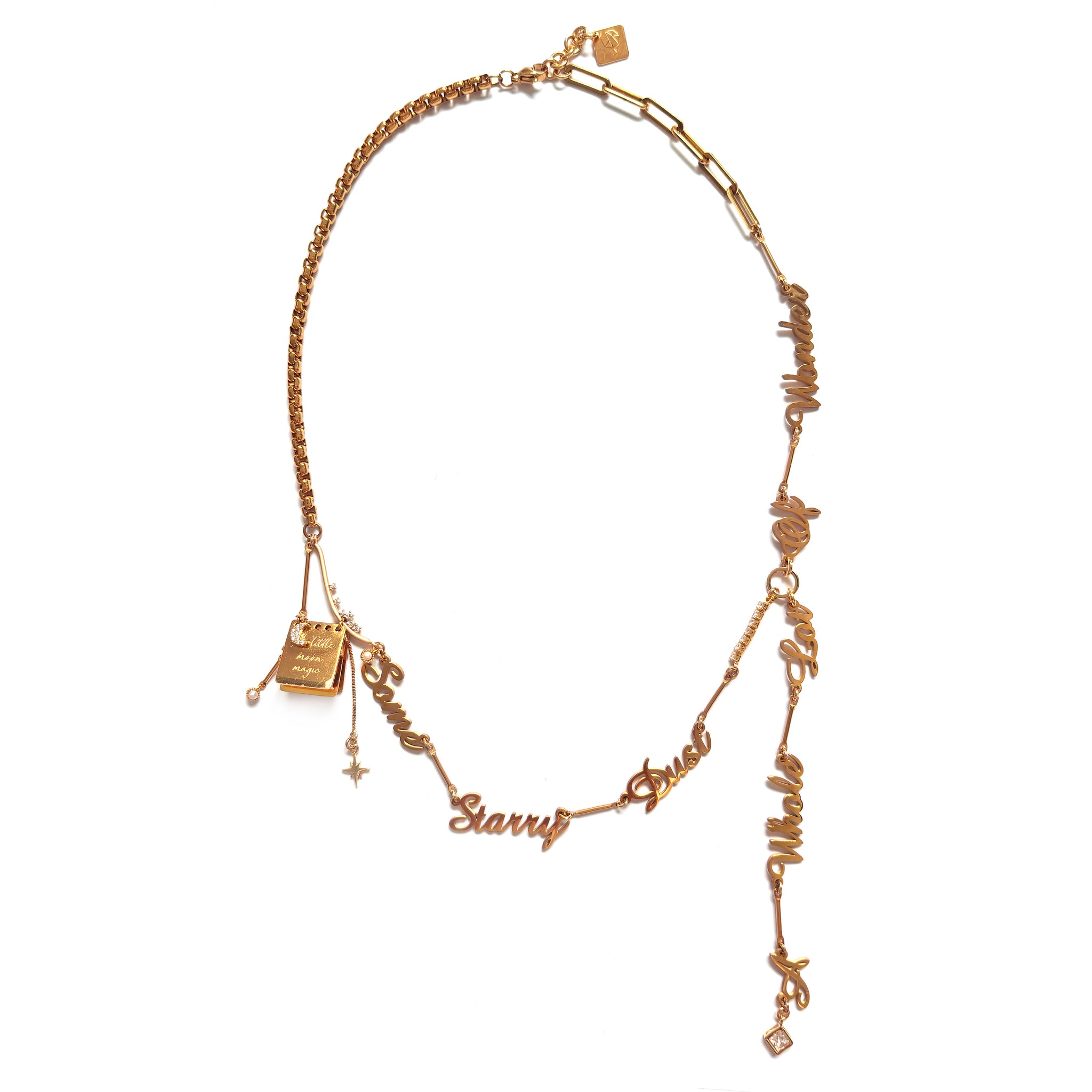 . 2-tier message necklace made of stainless steel - 'some starry dust' & 'a whole lot of wonder'. The first page reads ‘a little moon magic’, with the next two pages flowing out as linked word pendants.
